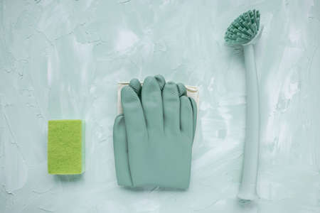 Dish washing brush, gloves, sponge on green background. Accessories for washing dishes, cleaning kitchen and hands protection concept, copy space