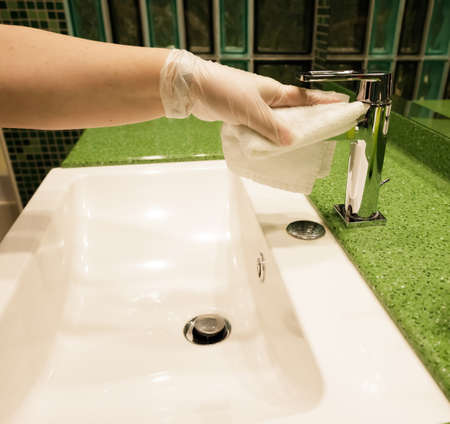 hand of invisible worker glove of nitrile washes the faucet over the washstand. selective focus.High quality photo