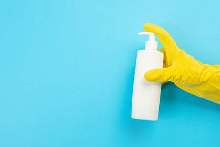 A hand in a yellow glove holds a white bottle of detergent on a blue background. Banner with copy space. Chemical cleaners, household chemicals, brushes and collage supplies.