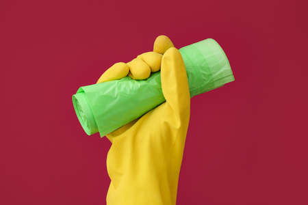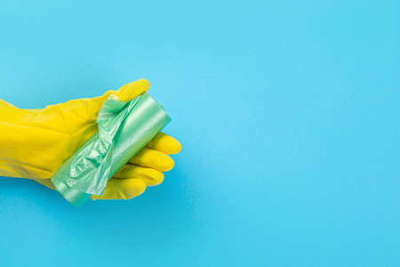 A hand in a yellow glove holds a plastic disposable trash bag on a blue background. place with copy space.