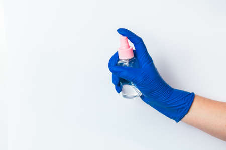 A hand in a blue latex glove holds a disinfectant. The concept of preventive protection against coronavirus. Use of antiseptics for cleaning.
