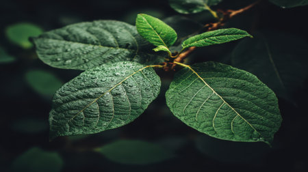 Lush Green Leaves with Intricate Veins Stand Out Against a Dark Background in a Dense Forest Scene