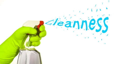 Hand in yellow rubber glove holding plastic spray bottle with cleaning detergent on yellow background
