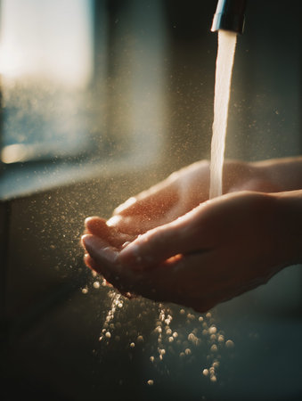 Hands receive a soft cascade of water, glistening in warm sunlight, evoking calm and tranquility.