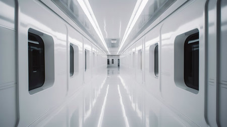 A futuristic hospital hallway features transparent enclosures housing patient beds and medical devices. The image showcases a clean, minimalist design with cool blue lighting creating a sterile ambiance. This composition could be used for illustrations related to healthcare, technology, or scientific concepts, and it's suitable for various commercial purposes.