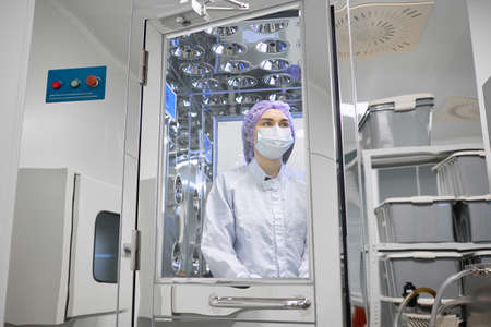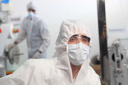 Scientists wearing protective clothing Inspect mask making machines in a laboratory at an industrial plant. Anti-virus production warehouse. concept of safety and prevention coronavirus covid-19.
