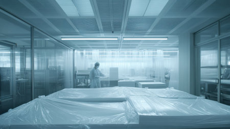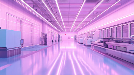 A panoramic view of a clean room, where delicate electronics are assembled under strict conditions. Generative AI