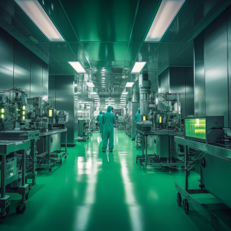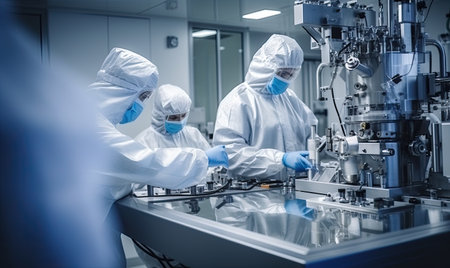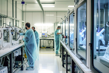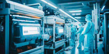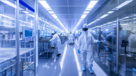 Workers dressed in cleanroom attire diligently operate in a highly sophisticated, hightech industrial environment