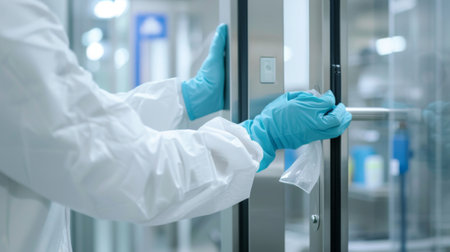 Detailed shot of a professional cleaning staff member in protective gear, diligently sanitizing door handles to maintain hygiene in a facility.