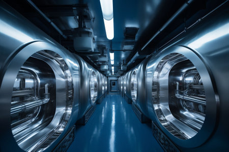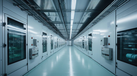 A corridor with a series of large, cylindrical autoclaves in a clean and futuristic industrial environment, illuminated by blue lighting. High quality photo