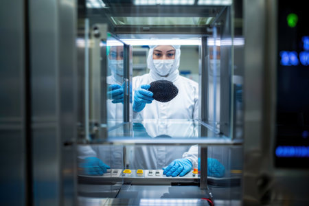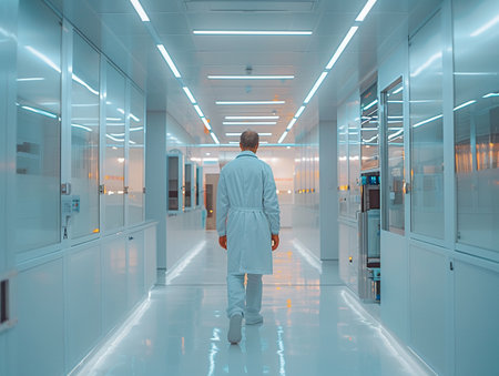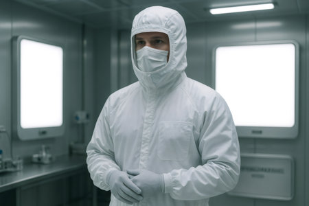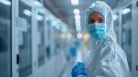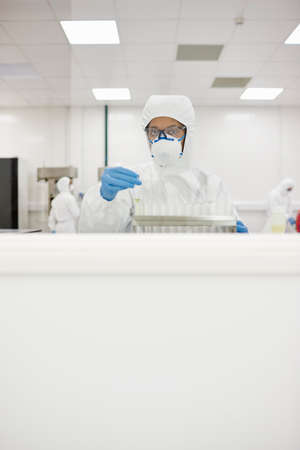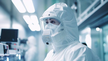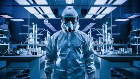 Scientist dressed in a sterile coverall and gloves, conducting research in a state of the art laboratory focused on innovative experiments
