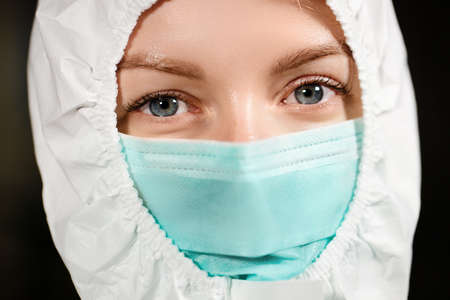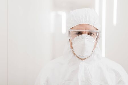 Portrait of a male doctor of European appearance in a medical mask, protective glasses and chemical suit.