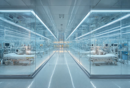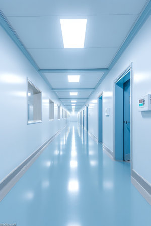 An interior shot reveals a hospital corridor lined with glass walls. The scene is dominated by a cool blue color palette with bright lighting. Medical beds and equipment are visible. The composition suggests a sterile and advanced environment, suitable for various commercial applications and editorial content.
