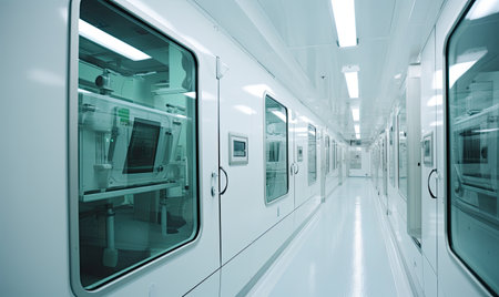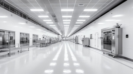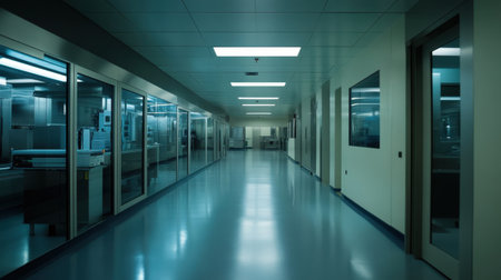 A serene and spacious hallway in a modern laboratory features bright overhead lighting and clear glass walls, showcasing a clean and innovative research environment.