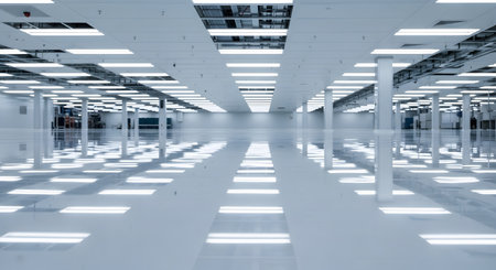 A vast, empty, and sterile modern space, such as a cleanroom or factory, with a highly polished white floor. The bright, rectangular ceiling lights are perfectly reflected on the glossy surface, creating a symmetrical and minimalist industrial scene.