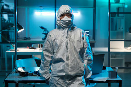 Young contemporary technician or scientist in protective workwear standing against desk with laptop and hardware
