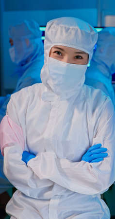 close up of an asian female design engineer in sterile coverall with crossed arms is looking at you - ultra modern electronic manufacturing factory