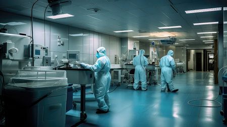 High-tech lab for a controlled environment for quality preservation, scientists in white coats monitoring equipment