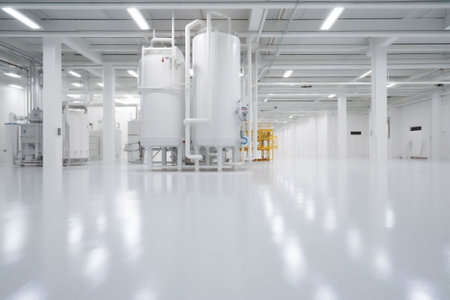 Sterile Factory Interior with White Halls, Cisterns, and Pipes, Ideal for Industries Processing Various Liquids Such as Milk, Oil, Fuel, Juice, Alcohol and Water with Copy Space. High quality photo