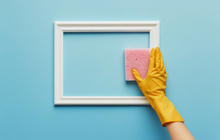 A hand wearing a yellow glove is using a pink sponge to clean a white picture frame. The vibrant blue background highlights the care taken in household cleaning activities.