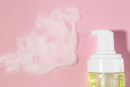 Bottle with cleansing foam on pink background, flat lay. Cosmetic product