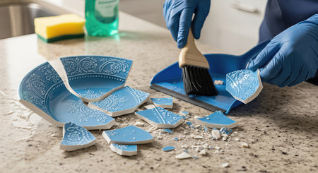 A pair of gloved hands uses a small brush and dustpan to gather shards of a shattered blue ceramic plate on a speckled countertop. The image highlights detail in the broken pieces and the cleaning process. Bright lighting creates a clear and focused view.