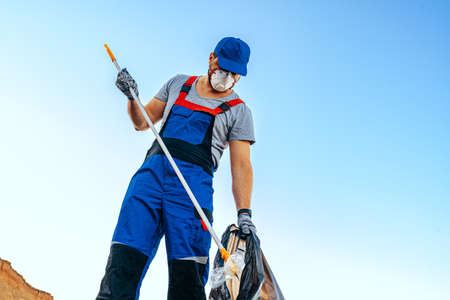 Man volunteer collecting garbage on the beach with a reach extender stick