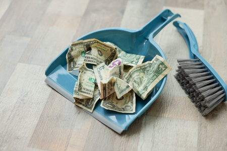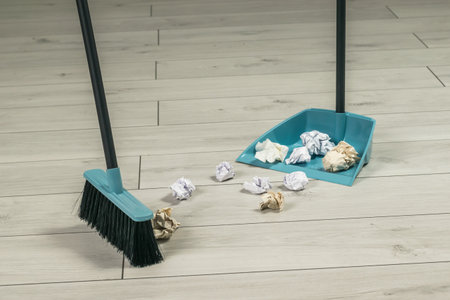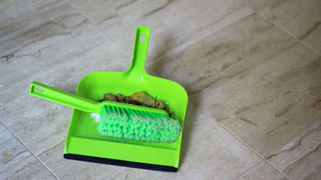Cleaning and home concept. Sweeping brush small whisk broom and dustpan for house work with garbage on floor indoors.