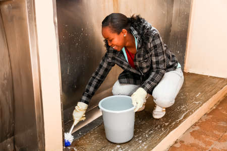 Soweto, South Africa - July 21, 2012: Diverse Women performing community service volunteer cleaning work at township school