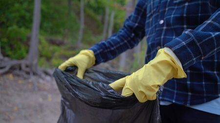 Volunteers collecting garbage in the forest. Nature pollution concept.