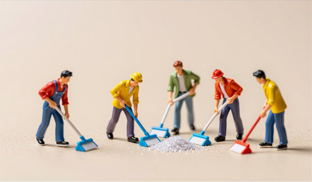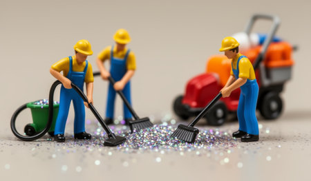 Five tiny figures in colorful outfits engage in a cleaning task, using small tools to sweep sparkles off a flat surface. Their teamwork showcases a playful take on hard work and creativity.