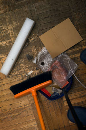 A plastic broom and dustpan set beside a pile of rubbish on the floor, ready for cleaning in a modern home
