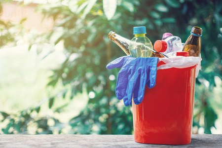 Plastic bottles of cleaning products in a bucket. Selective focus.