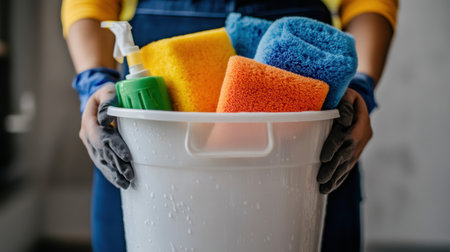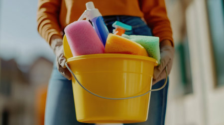 A cleaning lady holds a yellow bucket filled with cleaning supplies while preparing to tackle household tasks in a tidy setting.