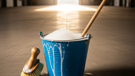 A cinematic, ultrawide environmental photograph (16:9) of a cleaning setup--a blue galvanized bucket