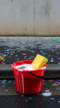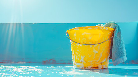 Bright yellow bucket splashed with soapy water and cleaning cloth, illuminated by dazzling sunlight against azure wall, evokes freshness of spring cleaning. Copy space