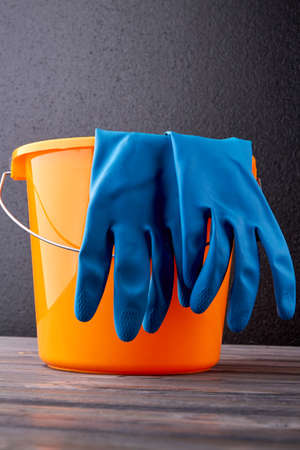 Bucket and gloves for cleaning on dark background. Household chores concept.