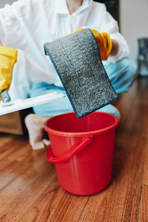 Woman in yellow rubber gloves cleaning floor with bucket of water and soapy water