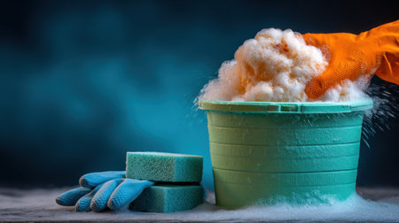 An image showcases a light green bucket overflowing with soap and foam, attended by a hand wearing an orange glove. Blue gloves and sponges are near it, creating a cleaning composition. The scene uses diffused lighting, suggesting an indoor setting. Potential applications include commercial and illustrative projects.
