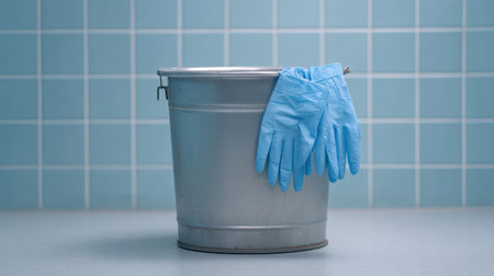 A pair of blue rubber gloves are placed on the edge of a shiny silver metal bucket, set against a light blue tiled background, perfect for cleaning and sanitation tasks.