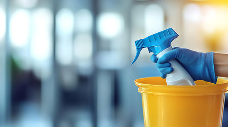 Close-up of a janitor's hand holding a bucket filled with cleaning products, ready for sanitizing a public area