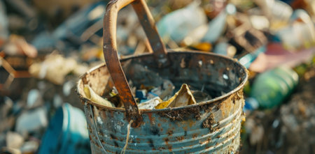A vertical, wide-angle 9:16 cinematic shot featuring a dirty red plastic bucket filled with heavily