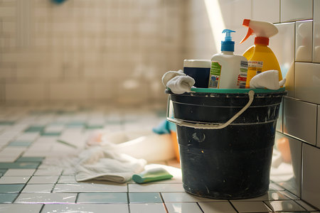 A yellow mop sits beside a bright bucket filled with cleaning solution, with bottles of detergent nearby. The setting is a damp, tiled room illuminated by soft artificial light.