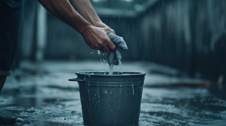 Hands wringing out a wet cloth over a bucket with rainwater around. Manual cleaning and sustainability concept.