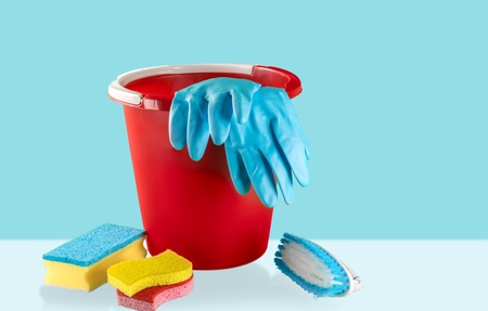 Arsenal for cleaning is on the grey background. Cleaning in a house. Clean and wash house. Cleaning production in a bucket.
