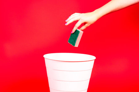 Washcloth in hand in front of the trash can, the concept of end of cleaning