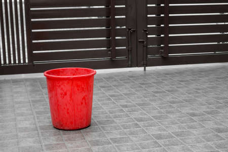 Plastic bucket and plastic hose on concrete wall background with copy space