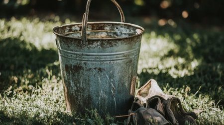 A weathered metal bucket sits on lush green grass next to a pair of gardening gloves, creating a rustic and nostalgic outdoor scene ideal for garden-related themes.