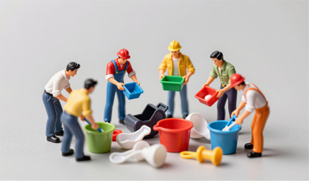 Miniature figures gather in a playful scene, working together to clean and sort various objects in bright, colorful buckets. The lively collaboration showcases teamwork and organization.