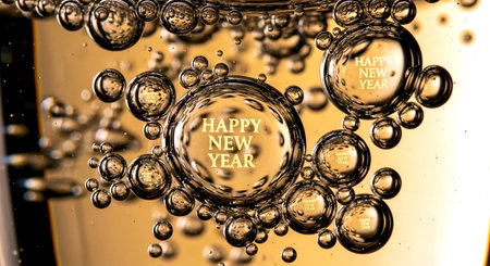 Bubbles in a glass of champagne with happy new year words